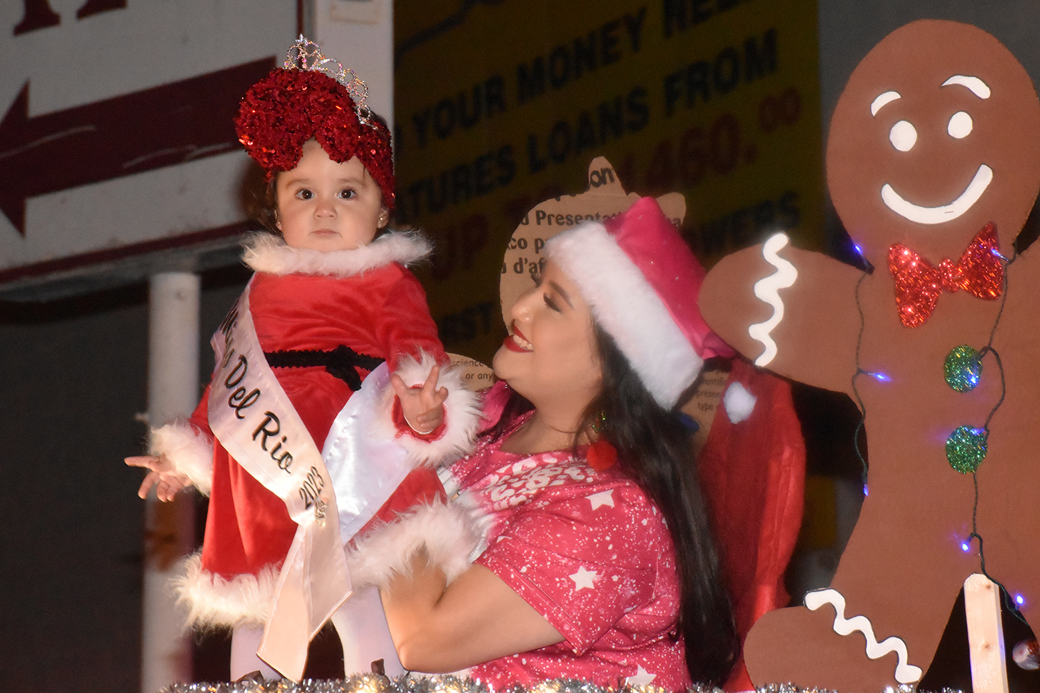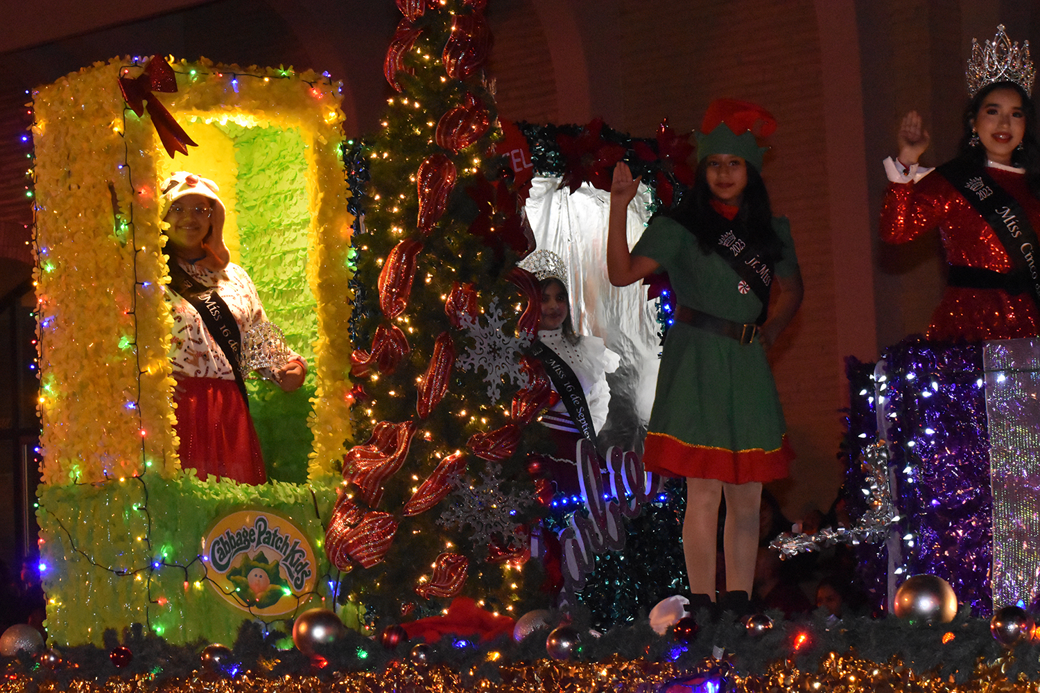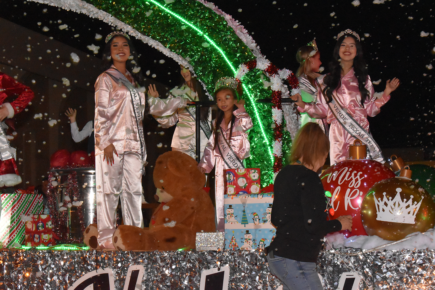 Second place went to the float that included the courts for Miss Del Rio and Miss Val Verde Texas dressed in holiday attire and sleepwear and utilizing a snow machine that scattered soap flakes into the cool night air to resemble a white Christmas. The entry also won the Snow Queen Award for Best Overall Queen Entry.